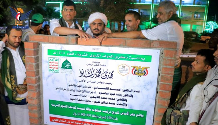 وضع نائب رئيس الوزراء للشؤون الاقتصادية وزير المالية الدكتور رشيد أبو لحوم ومعه محافظ الحديدة محمد عياش قحيم ورئيس اللجنة الرئاسية الدكتور أحمد الهادي حجر الأساس لمشروع تركيب منظومة طاقة شمسية لجامعة العلوم الشرعية بالحديدة.
