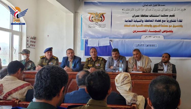 ناقش لقاء تشاوري موسع عقد اليوم بمحكمة استئناف محافظة عمران، أوضاع السجناء المعسرين، وإيجاد الحلول لتسديد ماعليهم للغير والإفراج عنهم.