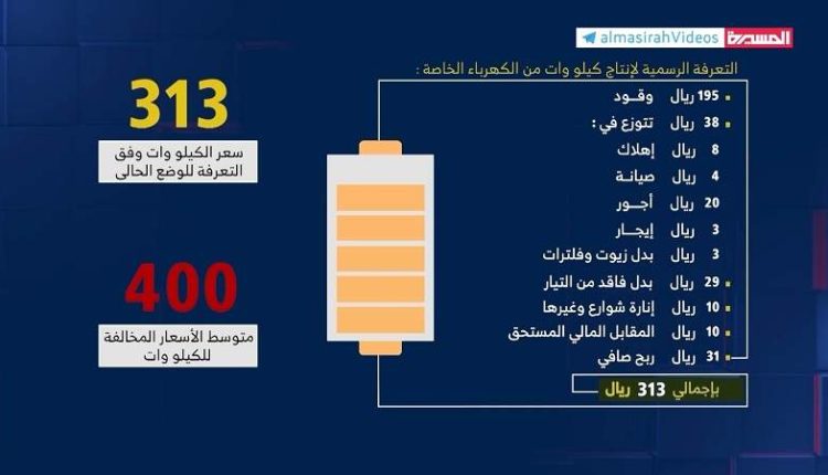 كشف تحقيق لقناة المسيرة أن القطاع الخاص يفرض أسعارا مرتفعة تزيد عن التعرفة المقدرة من وزارة الكهرباء والطاقة بنسبة 22%.