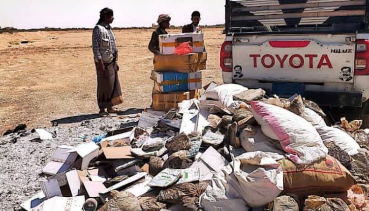 اتلف مركز الحزم ونهم الجمركي بمحافظتي الجوف وصنعاء كمية من الأدوية والتمور التالفة والممنوعة.