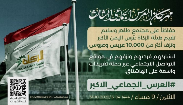 تنطلق الساعة التاسعة من مساء اليوم، حملة تغريدات على موقع التواصل الاجتماعي “تويتر” بمناسبة العرس الجماعي الثالث الأكبر على مستوى العالم، الذي أقامته الهيئة العامة للزكاة لعشرة آلاف و44 عريسا وعروسا.