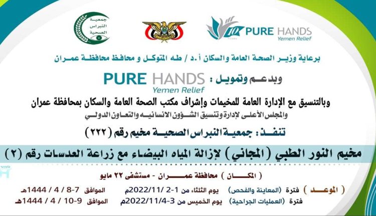 تنفذ جمعية النبراس الصحية غدا الثلاثاء بمستشفى 22 مايو بمحافظة عمران مخيم النور الطبي المجاني الـ(222) لإزالة المياه البيضاء وزراعة العدسات بدعم وتمويل من منظمة الأيادي النقية.