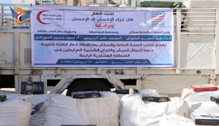 وخلال تسيير القافلة، أشاد محافظ ذمار محمد البخيتي بجهود مكتب الصحة في تقديم القافلة، والتي تعبر عن الوفاء للمرابطين وتقديرا لدورهم وتضحياتهم في مواجهة العدوان.
