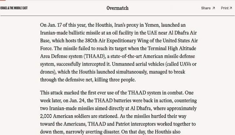 وأكد التقرير أن الطائرات بدون طيار أو ما تسمى بالطائرات المسيرة، التي أطلقها اليمن في وقت واحد ضد الإمارات، تمكنت من اختراق المنظومة الدفاعية بنجاح وحققت أهدافها بدقة عالية، مضيفاً بالقول: “لقد كان هذا الهجوم أول استخدام على الإطلاق لنظام الدفاع الجوي الأمريكي ثاد في القتال”.