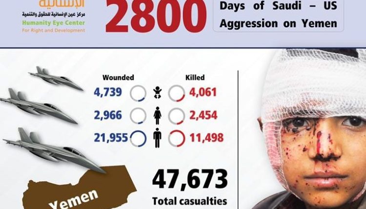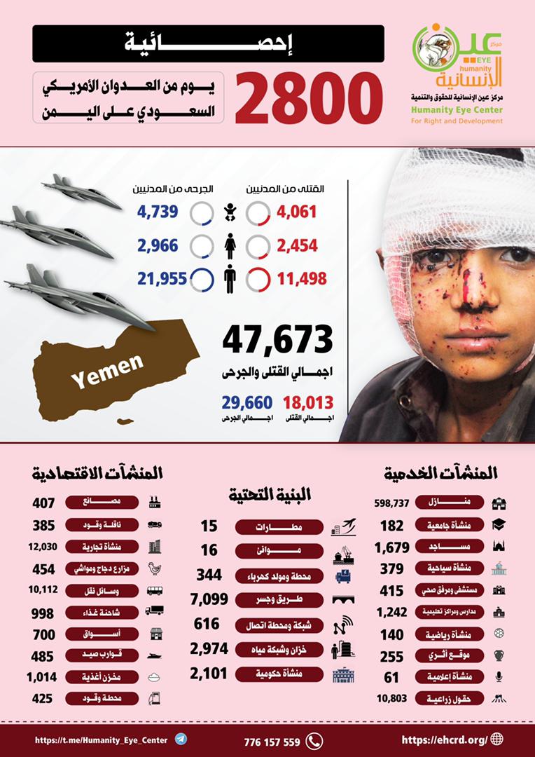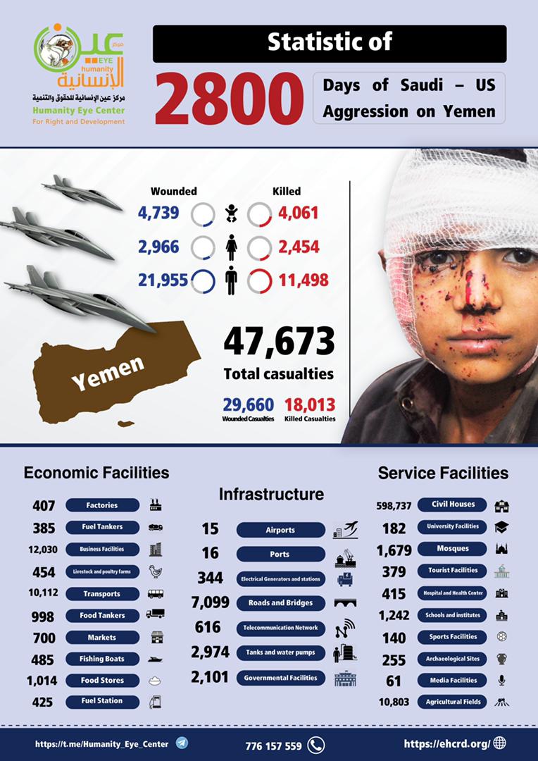 أصدر مركز عين الإنسانية، اليوم السبت، تقريراً يوثق جرائم العدوان الأمريكي السعودي الإماراتي بحق الشعب اليمني خلال 2800 يوم من العدوان.