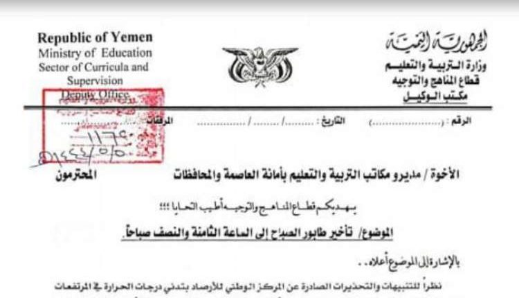 ووجه التعميم الصادر من وكيل وزارة التربية والتعليم احمد النونو مدراء مكاتب التربية بتأخير طابور الصباح المدرسي إلى الساعة الثامنة والنصف صباحاً.. ابتداء من السبت المقبل 9/جمادى الأول/1444ﮪ الموافق 3/ديسمبر/2022م.
