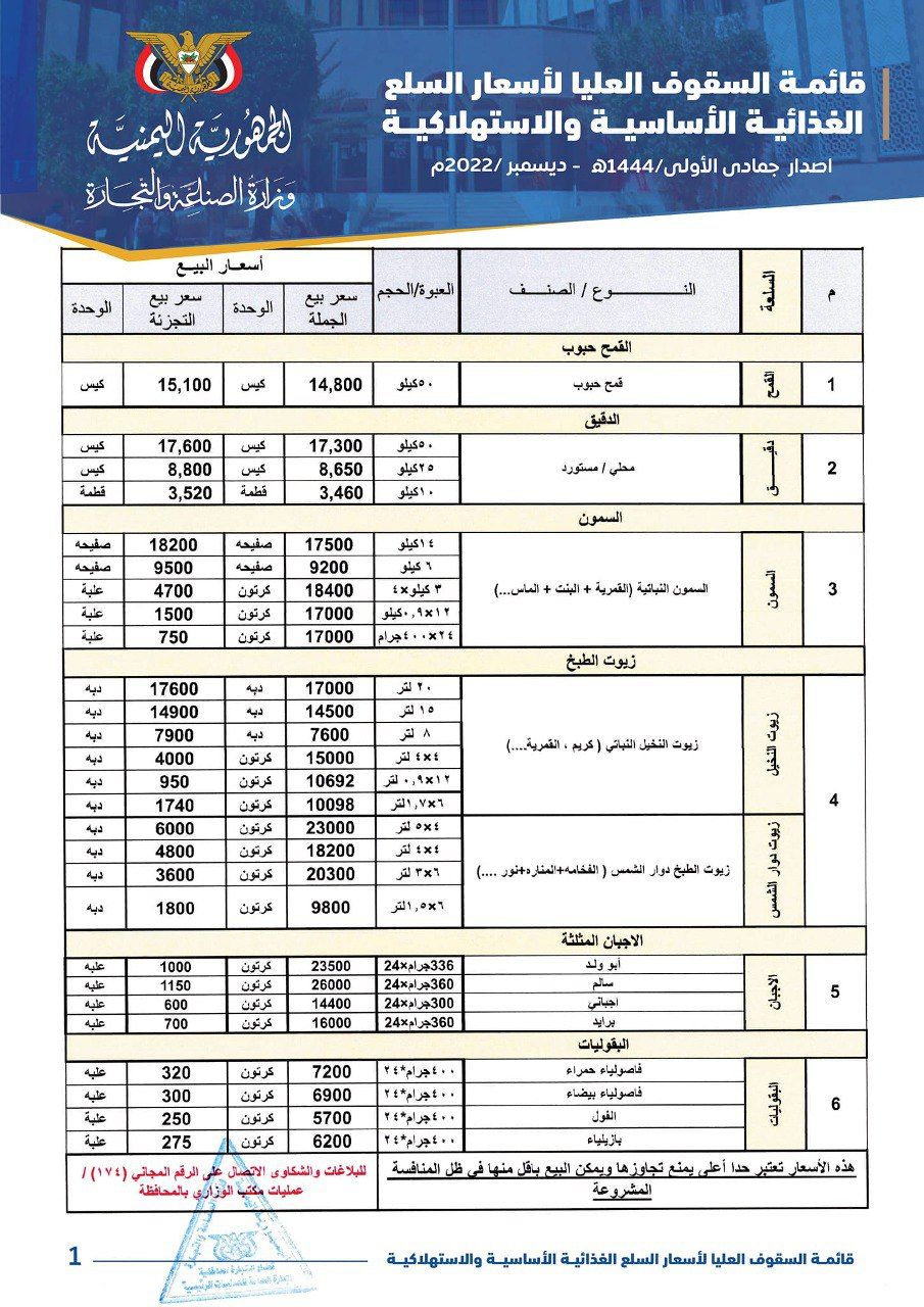 وحددت سعر القمح الحبوب 50 كيلو جرام بمبلغ 14800ريال للجملة و و15100 ريال للتجزئة , كما حددت سعر كيس الدقيق 50 كيلو جرام بمبلغ 17300 ريال للجملة و مبلغ 17600 للتجزئة .