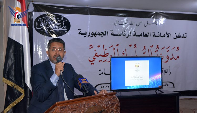 وفي التدشين أكد أمين عام رئاسة الجمهورية، حسن أحمد شرف الدين، أهمية مدونة السلوك الوظيفي في الالتزام بالضوابط والمعايير والأحكام والمبادئ المستندة على الهوية الإيمانية وتعاليم الإسلام والقرآن الكريم والنبي الكريم صلى الله عليه وآله وسلم.