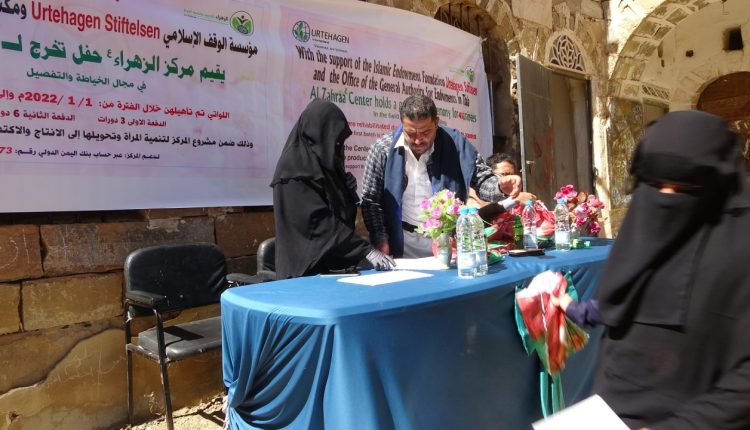 بمناسبة الذكرى السنوية للشهيد 1444هـ احتفل مركز الزهراء بتأهيل وتخرج 45 متدربة من أسر الشهداء والجرحى والمرابطين بمديرية ثلاء محافظة عمران، بدعم من مؤسسة الوقف الإسلامي Urtehagen Stiftelsen ومكتب الهيئة العامة للأوقاف بالمديرية.