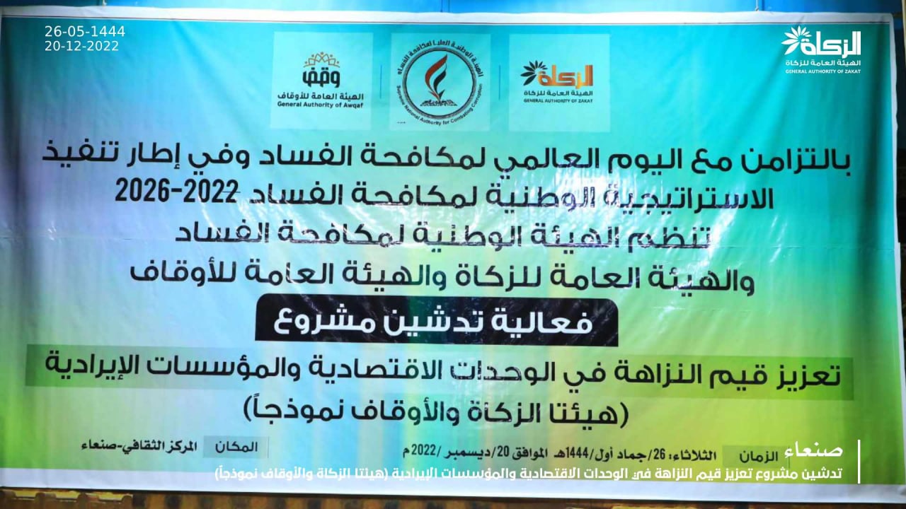 صنعاء تدشن مشروع تعزيز قيم النزاهة في الوحدات الاقتصادية والمؤسسات الإيرادية ” هيئتا الزكاة والأوقاف نموذجاً”