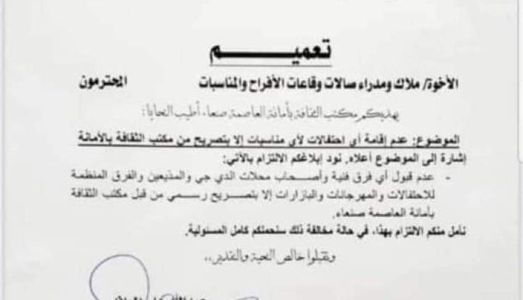 وكشف نصر الدين عامر، رئيس مجلس ادارة وكالة سبأ الرسمية، بتوجيه الحكومة بإلغاء قرار لمكتب الثقافة يلزم صالات الاحتفالات والاعراس بأخذ اذن مسبق من المكتب في أمانة العاصمة قبل اقامة أية فعالية.