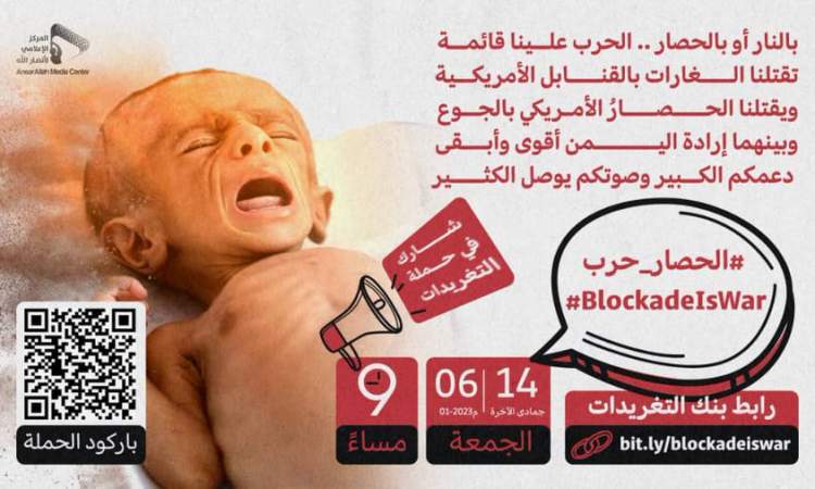 تنطلق الساعة التاسعة من مساء اليوم الجمعة حملة تغريدات عبر موقع التواصل الاجتماعي “تويتر”، تحت شعار ” الحصار حرب ” للتنديد باستمرار العدوان والحصار على الشعب اليمني.