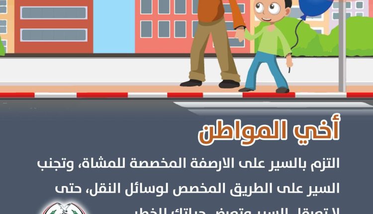 أخي المواطن: التزم بالسير على الأرصفة المخصصة للمشاه، وتجنب السير على الطريق المخصص لوسائل النقل، حتى لا تعرقل السير وتعرض حياتك للخطر..