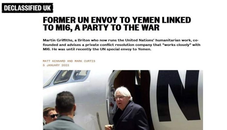 كشف موقع (Declassified UK) الاستقصائي البريطاني، بأن مبعوث الأمم المتحدة السابق إلى اليمن مارتن غريفيث، مرتبط بجهاز الاستخبارات البريطاني، ما يؤكد ارتهان الأمم المتحدة ومسؤوليها لأجهزة الاستخبارات الغربية، ويؤكد صوابية الموقف اليمني بعدم حياد المبعوثين وبتبنيهم أجندة تلك الدول.