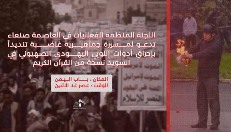 دعت اللجنة المنظمة للفعاليات بالعاصمة صنعاء للخروج الشعبي عصر غد الاثنين، للتنديد بإحراق أدوات اللوبي اليهودي الصهيوني في السويد نسخة من القرآن الكريم.