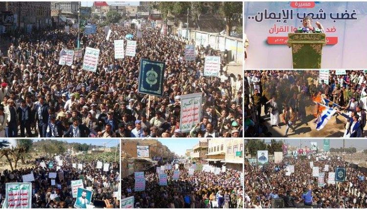 شهدت مدينة ذمار ومديريات جبل الشرق وعتمة ووصاب العالي ووصاب السافل، اليوم الأربعاء، مسيرات حاشدة تنديداً بحرق نسخة من المصحف الشريف في السويد، تحت شعار “غضب شعب الإيمان ضد من أحرقوا القرآن”.