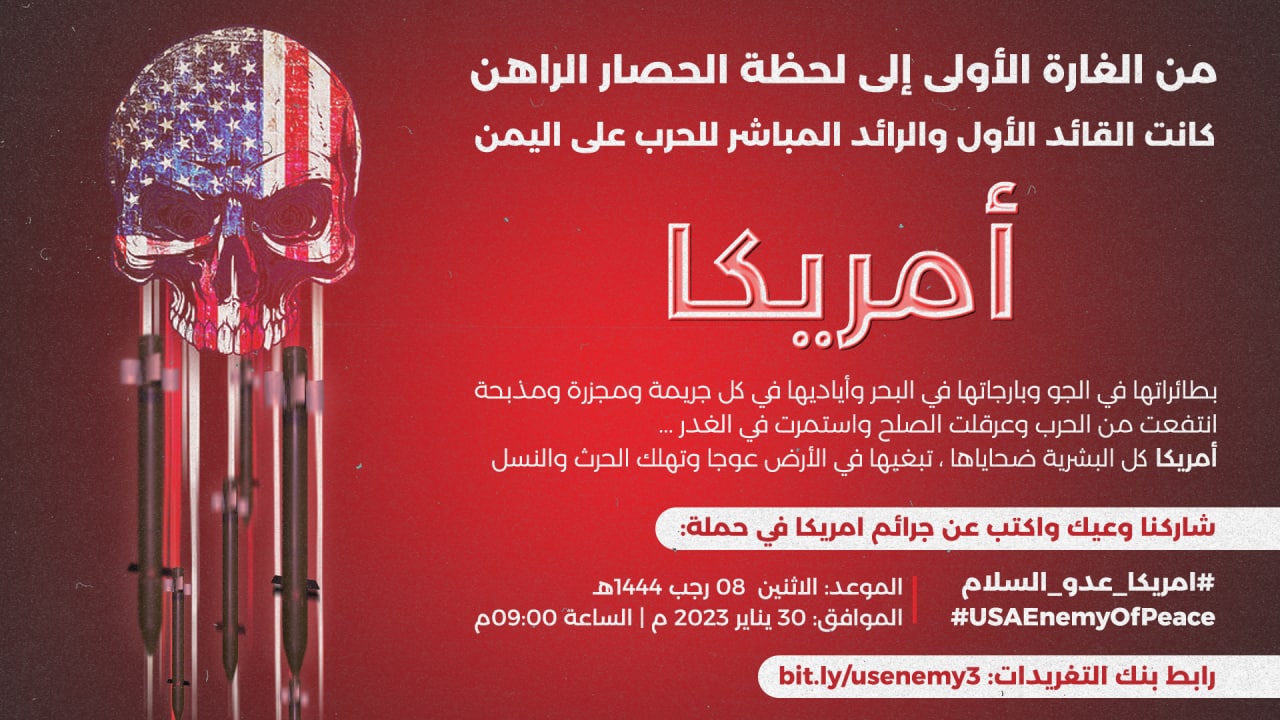 وتأتي الحملة لكشف الدور الأمريكي المباشر في العدوان على اليمن منذ الغارة الأولى إلى لحظة الحصار الراهن، الذي ما تزال طائراتها في الجو وبارجاتها في البحر وأياديها في كل جريمة ومجزرة ومذبحة في اليمن، إلى جانب دورها الإجرامي في عرقلت الصلح وفرص السلام في اليمن واستمرارها في الغدر، ما يؤكد انها رأس الشر في العالم وضحاياها كل البشرية.