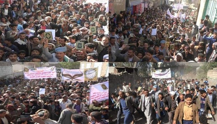 إب.. مسيرة غاضبة في القفر تنديداً بحرق القرآن واحتجاز المواطنة مروة الصبري