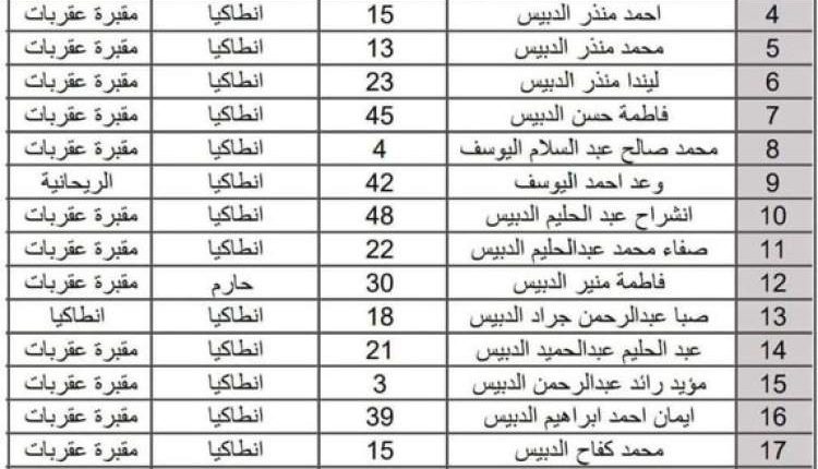 ونشر مراسل قناة العربية ردفان الدبيس أسماء 21 فردا بينهم أطفال ونساء قالوا انهم لقو حتفهم في الزلزال الذي ضرب مدينة انطاكيا وتم دفنهم هناك.
