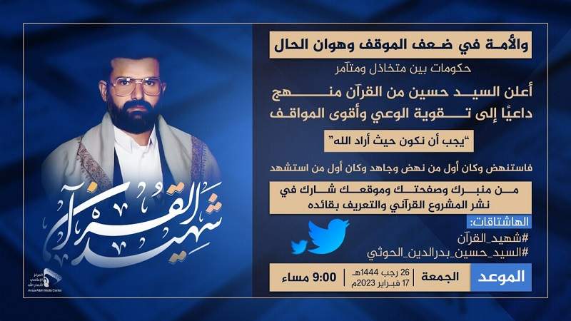 تنطلق الساعة التاسعة من مساء اليوم الجمعة، حملة تغريدات عبر موقع التواصل الاجتماعي “تويتر”، للتعريف بقائد المشروع القرآني حسين بدر الدين الحوثي.