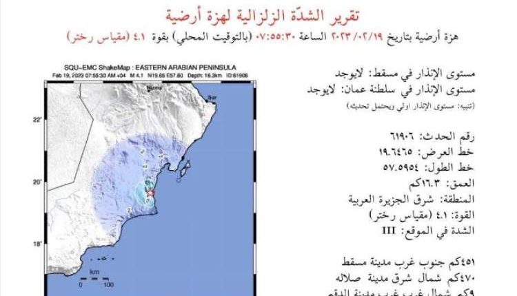 وقال مركز رصد الزلازل، التابع لجامعة السلطان قابوس، على “تويتر”، إن زلزالا بقوة 4.1 درجات وقَع الساعة 7:55 بالتوقيت المحلي (3:55 ت.غ) على عمق 16.3 كليو مترا، وعلى بعد 451 كيلومترا جنوب غرب العاصمة مسقط.