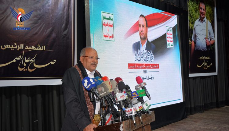 وتابع: “نقف اليوم لحظة شديدة المهابة في قلب صنعاء التاريخ والاصالة والعروبة والاسلام.. صنعاء جوهر المقاومة ضد المشروع الصهيوني الزائل وضد كل المشاريع الارتهانية للغزاة والمحتلين والطامعين والمتآمرين لنحيي ذكرى سنوية مفعمة بالمعاني العظيمة.. معاني التضحية وقيم البناء والعطاء ذكرى استشهاد قائد عظيم كان يمثل مشروعا وطنيا جامعا انه الرئيس الشهيد صالح الصماد”.