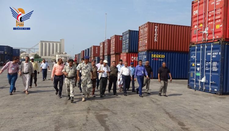 وزير النقل يتفقد ساحات محطة الحاويات وتنظيم دخول السفن وتفريغ البضائع بميناء الحديدة