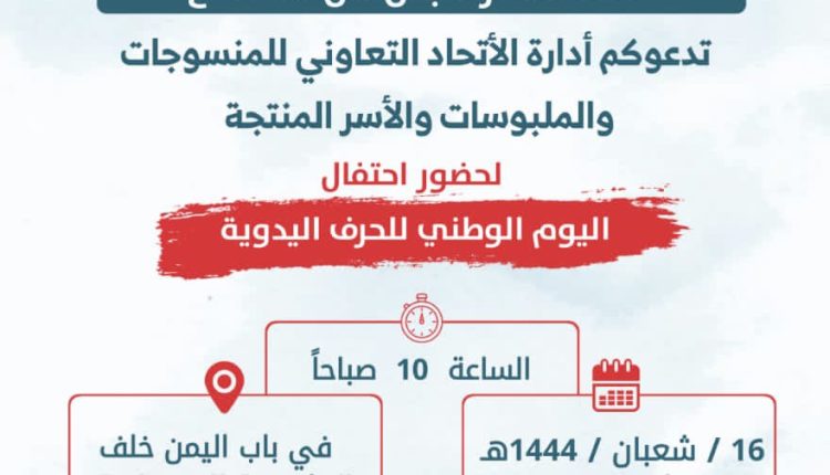 يدشن الاتحاد التعاوني للملبوسات والمنسوجات غداً الأربعاء بصنعاء، فعاليات اليوم الوطني للحرف اليدوية الثامن من مارس من كل عام .