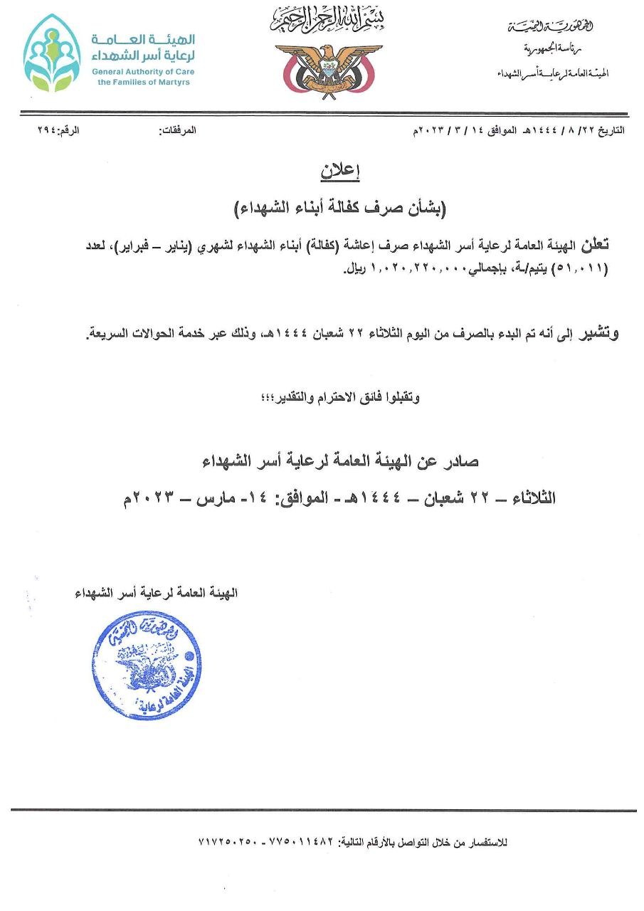 أعلنت الهيئة العامة لرعاية أسر الشهداء عن صرف كفالة أبناء الشهداء لشهري يناير- فبراير لعدد (٥١.٠١١) يتيم ويتيمة بمبلغ إجمالي (١.٠٢٠.٢٢٠.٠٠٠).