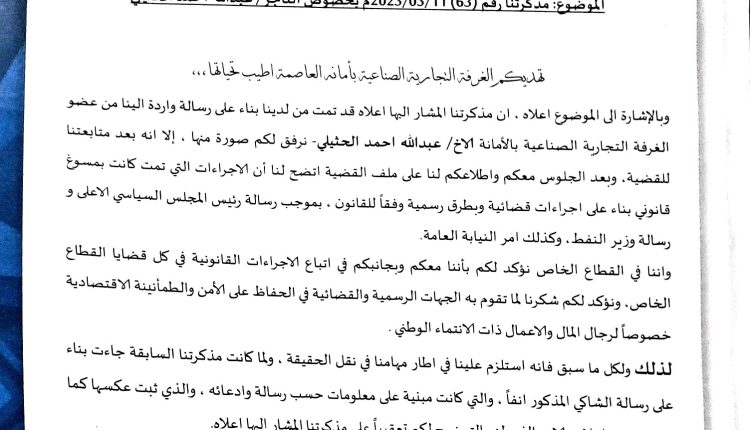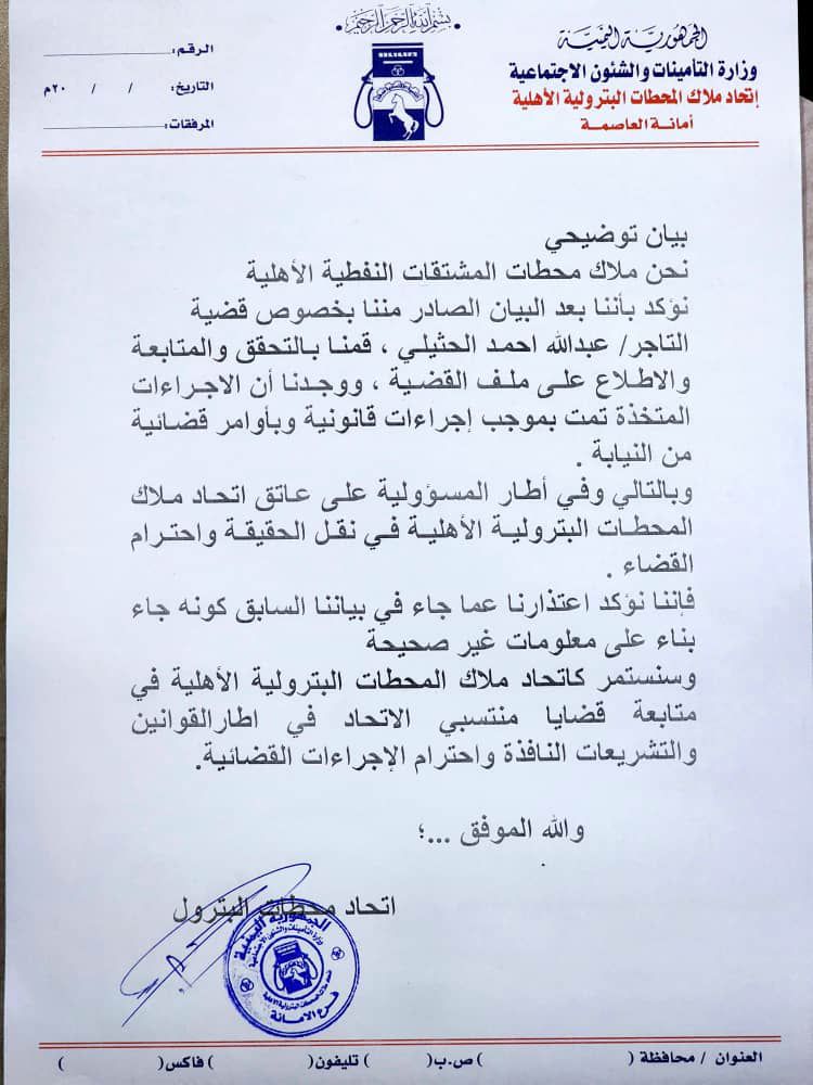 هذا وتأتي مذكرة الغرفة التجارية والصناعية في الأمانة، وبيان اتحاد ملاك محطات المشتقات النفطية الأهلية تعقيبا على بيانين منفصلين قد صدرا عنهما في وقت سابق وفق ما قالا عنه معلومات مغلوطة قدمت لهما من قبل التاجر“ الحثيلي ”.