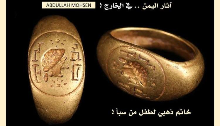 وقال محسن في صفحته على موقع التواصل الاجتماعي فيسبوك: ان خاتم ذهبي لطفل من سبأ ضمن مجموعة من الاثار اليمنية يعرض للبيع في إحدى دور عرض الفنون الأوروبية مشيرا ان الخاتم من الذهب اليمني القديم، “يتميز بإطار بيضاوي مزخرف. يتألف من طوق سميك على شكل الدال باللغة الإنجليزية، يتجه للخارج عند الجوانب العلوية قبل أن يتسع ليشمل الإطار. الجزء العلوي من الحلقة مسطح محفور فيه صورة جانبية لوجه شاب. تم استخدام خطوط محززة لإنشاء جزيئات شعره. وتحيط به أربعة حروف مسند من اليمين (أ) و(م) ومن اليسار (ن) و(د)، كما يظهر قرص الشمس مع خمسة أشعة أعلى وأسفل وجه الخاتم. ويشير الحجم الصغير للحلقة إلى أن هذا كان خاتماً لطفل”، ويزن: 8.74 جرامات.