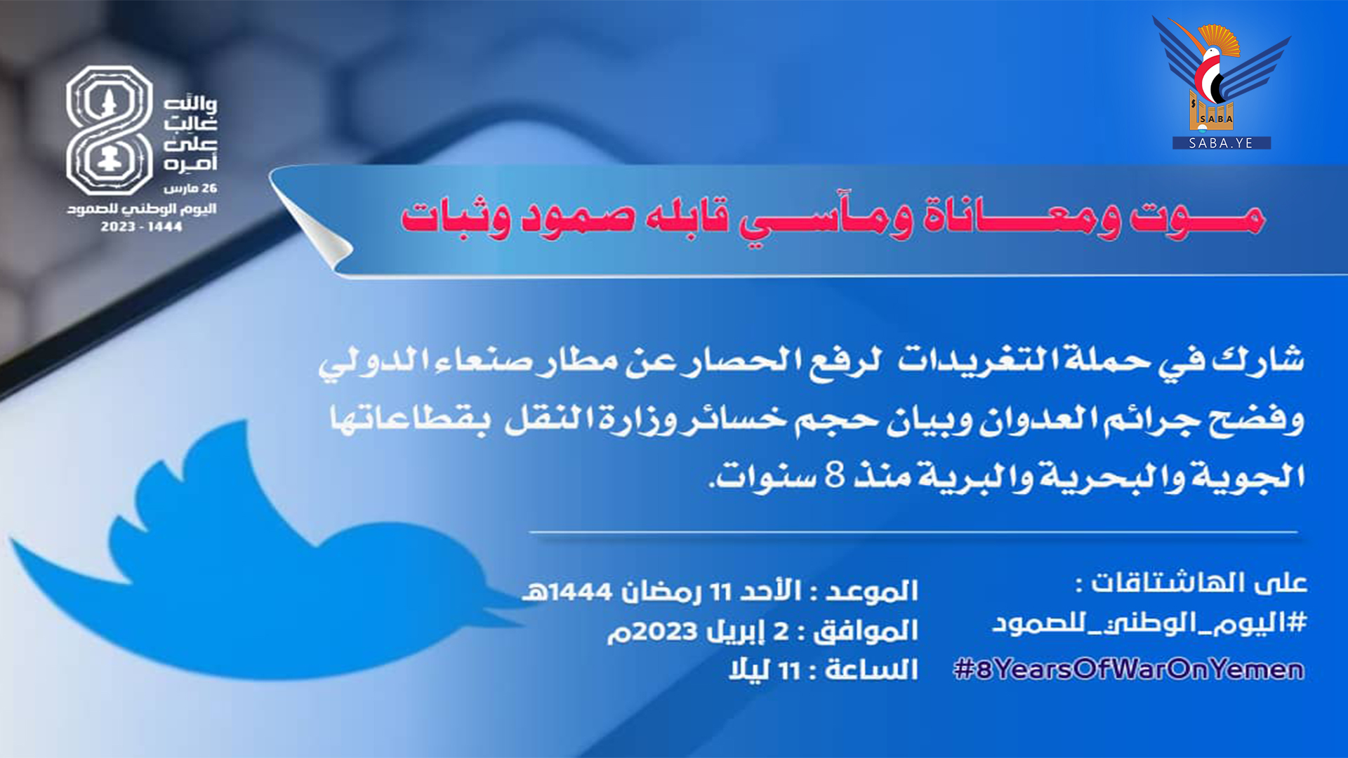 تنطلق الساعة الحادية عشر من مساء اليوم حملة تغريدات على موقع التواصل الاجتماعي “تويتر” تنظمها وزارة النقل والهيئات والمؤسسات التابعة لها, لرفع الحصار عن مطار صنعاء الدولي.