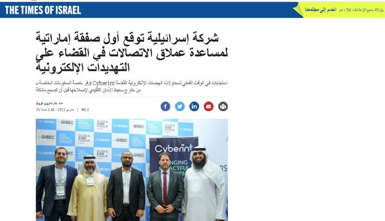 وقال موقع صحيفة “تايمز أوف إسرائيل”، إن شركة (Cyberint Technologies Ltd) الإسرائيلية المتخصصة في الاستخبارات الإلكترونية، وقعت بتاريخ 15 مارس الماضي اتفاقية مع شركة الاتصالات الإماراتية لحماية بنيتها التحتية من “تهديدات الهجمات السيبرانية”.