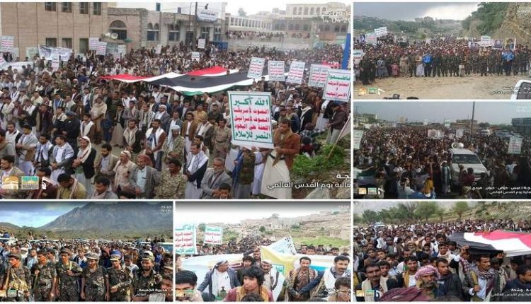 احتشّد أبناء حجة في مركز المحافظة والمديريات اليوم الجمعة، في 20 ساحة بيوم القدس العالمي.