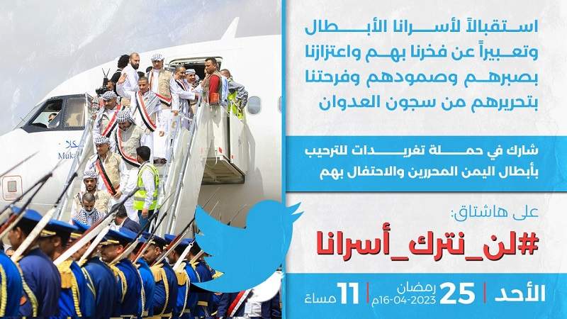 تنطلق مساء اليوم الأحد، حملة تغريدات واسعة، استقبالاً لأسرانا الأبطال وتعبيراً عن فخرنا بهم واعتزازنا بصبرهم وصمودهم، وفرحتنا بتحريرهم من سجون العدوان.