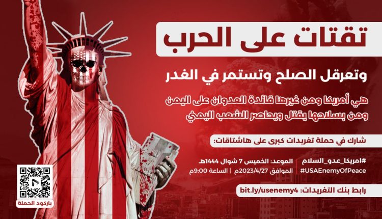 تنطلق في الساعة التاسعة من مساء اليوم، حملة تغريدات عبر موقع التواصل الاجتماعي “تويتر”، بعنوان “أمريكا عدو السلام”.