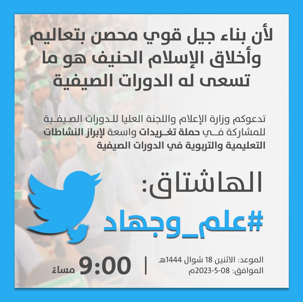 ودعت وزارة الإعلام واللجنة العليا للدورات الصيفية، للمشاركة في حملة التغريدات الواسعة، وذلك على هاشتاق: