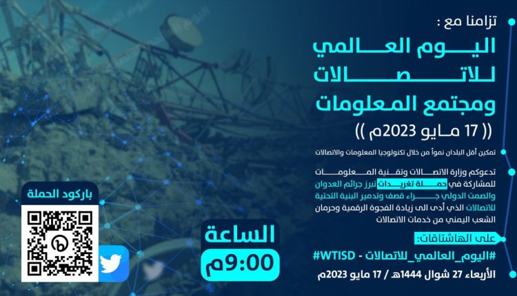 ودعت وزارة الإتصالات وتقنية المعلومات في بيان إلى المشاركة في حملة التغريدات لإبراز جرائم العدوان والصمت الدولي جراء تدمير البنية التحتية للاتصالات الذي أدى إلى زيادة الفجوة الرقمية وحرمان الشعب اليمني من خدمات الاتصالات.