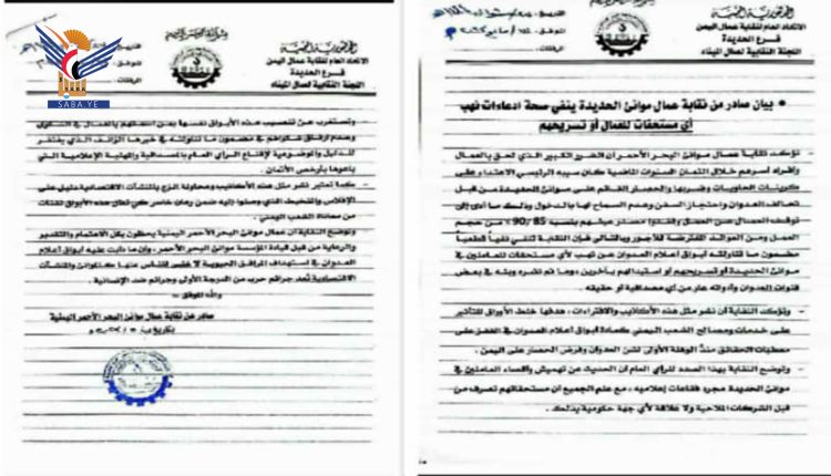 نقابة عمال موانئ الحديدة تنفي “إدعاءات نهب مستحقات العمال”