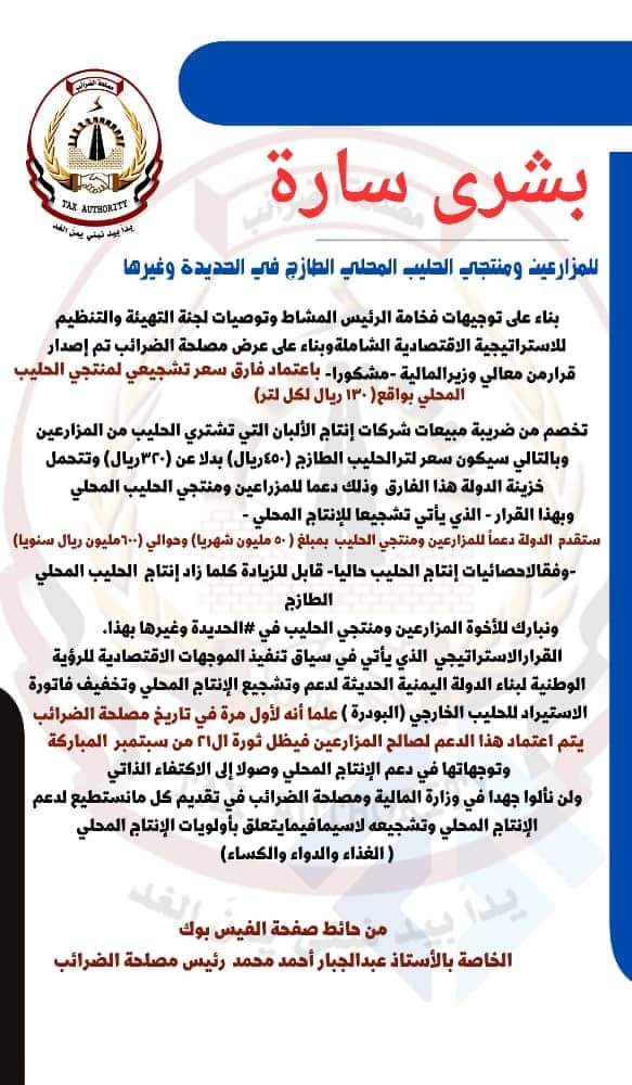 أعلنت مصلحة الضرائب إصدار قرار هو الأول من نوعه يمثل بشرى سارة للمزارعين ومنتجي الحليب المحلي الطازج في الحديدة وغيرها.