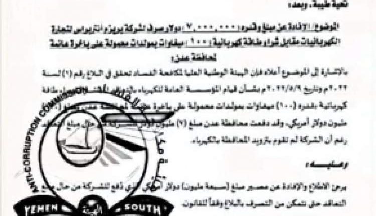 والوثيقة وزعتها الهيئة الوطنية العليا لمكافحة الفساد في عدن وتطالب فيها محافظ الانتقالي في عدن، أحمد لملس، بالكشف عن مصير 7 ملايين دولار استحوذ عليها بحجة استئجار 100 ميغاوات من الكهرباء لعدن من شركة كهرباء عائمة ولم ينفذ المشروع.