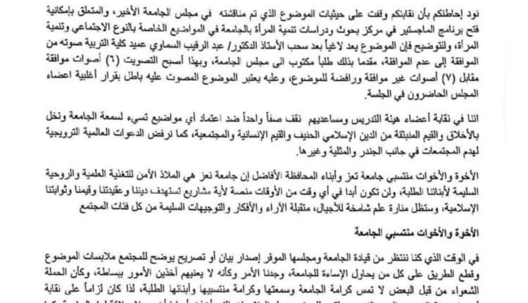 ودفع البيان العديد من أعضاء هيئة رئاسة جامعة تعز للانسحاب من التصويت على المشروع خشية تصفيتهم، خصوصا وأنه تزامن مع حملة تحريض واسعة وتكفير ضد رئاسة الجامعة.