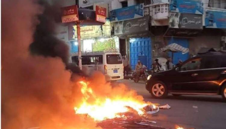 أضرمت عناصر من حزب الإصلاح محتجين النار في صور طارق عفاش رفعت في شوارع مدينة تعز.