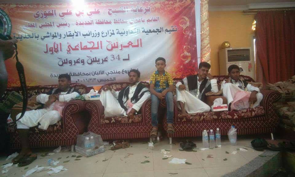 احتفل 34 عريسا وعروسا بمحافظة الحديدة اليوم بإكمال نصف دينهم في العرس الجماعي الأول الذي نظمته جمعية مزارعي وزرائب الأبقار بالمحافظة.
