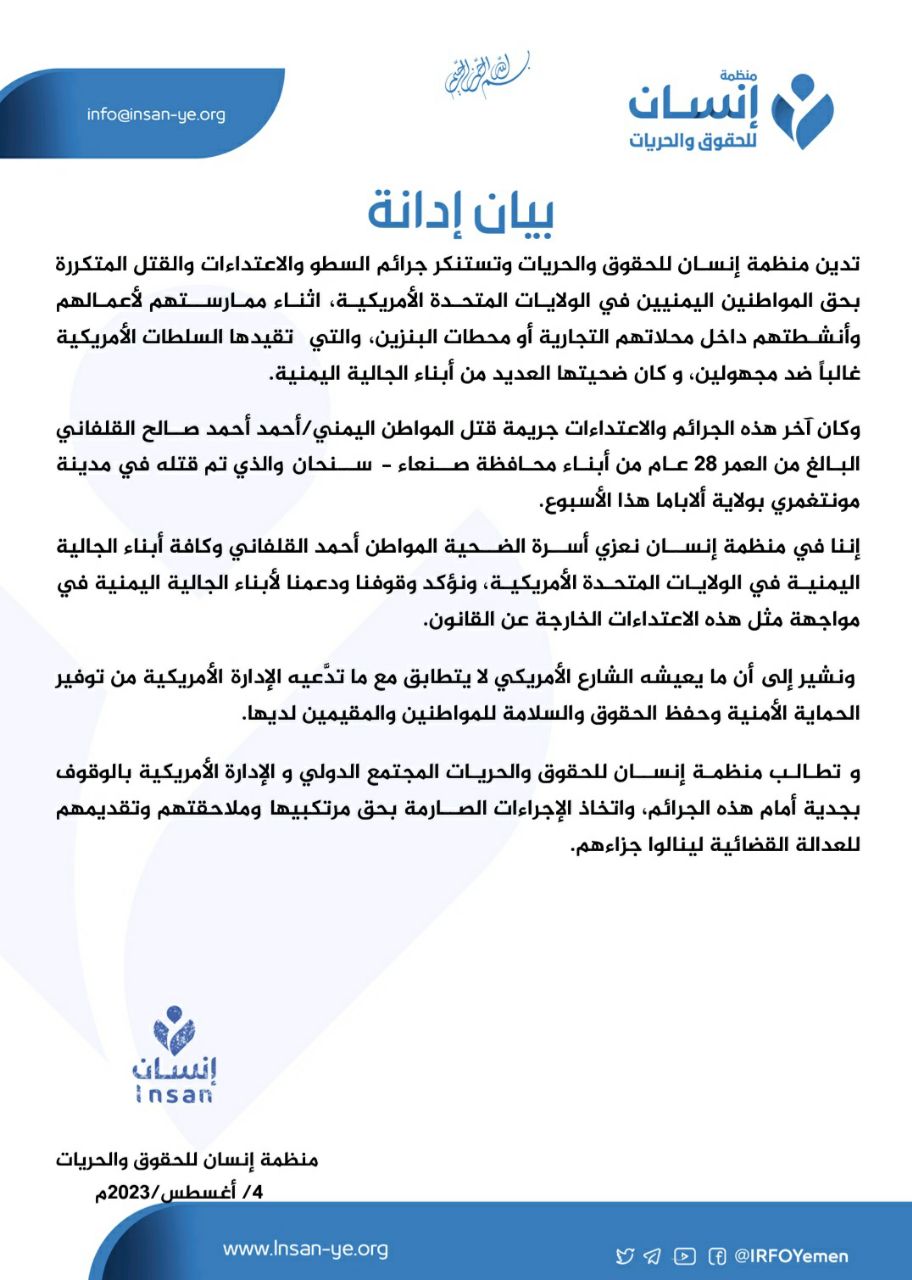 أدانت منظمة إنسان للحقوق والحريات جرائم السطو والاعتداءات والقتل المتكررة بحق المواطنين اليمنيين في الولايات المتحدة الأمريكية، أثناء ممارستهم لأعمالهم وأنشطتهم داخل محلاتهم التجارية وغيرها.