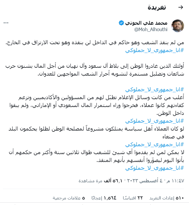 وتابع الحوثي بالقول: أغلب من كانت وسائل الإعلام تطبّل لهم من المسؤولين والأكاديميين وتزعم كفاءتهم كانوا عملاء، فخرجوا وراء استمرار المال السعودي أو الإماراتي، ولم يبقوا داخل الوطن.