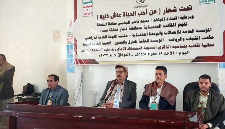 نظمت مكاتب المؤسسة العامة للاتصالات والشباب والوحدة التنفيذية لمشاريع الاتصالات وهيئتي الأراضي والبريد ومؤسسة الطرق بمحافظة ذمار اليوم الأحد ، فعالية ثقافية بذكرى استشهاد الإمام زيد بن علي عليهما السلام تحت شعار “من أحب الحياة عاش ذليلا”.