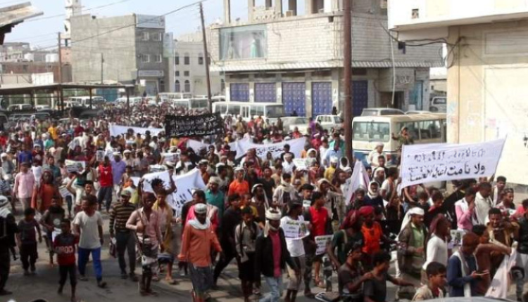 وحمّل المحتجون، حكومة المرتزقة ومجلسها الرئاسي، مسؤولية الانهيار الاقتصادي والمعيشي، متهمين ما وصفوها بأدوات التحالف بسرقة عائدات الثروات اليمنية وتسخيرها لصالحهم الخاص بينما يتضور الناس جوعاً.