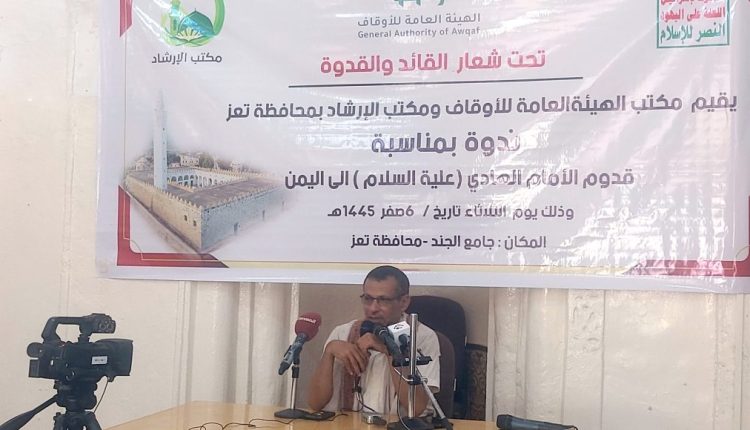 نظم مكتبا وزارة الإرشاد وهيئة الأوقاف بمحافظة تعز، اليوم الثلاثاء ، ندوة بمناسبة ذكرى قدوم الإمام الهادي – علية السلام إلى اليمن تحت شعار ” القائد والقدوة “.
