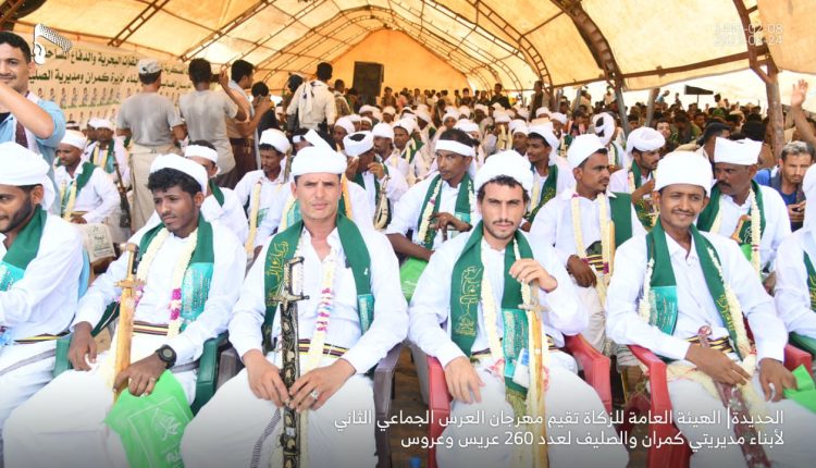 نظم مكتب الهيئة العامة للزكاة بمحافظة الحديدة اليوم في جزيرة كمران عرساً جماعياً لـ 260 عريساً وعروسا من أبناء الجزيرة ومديرية الصليف بالمحافظة.